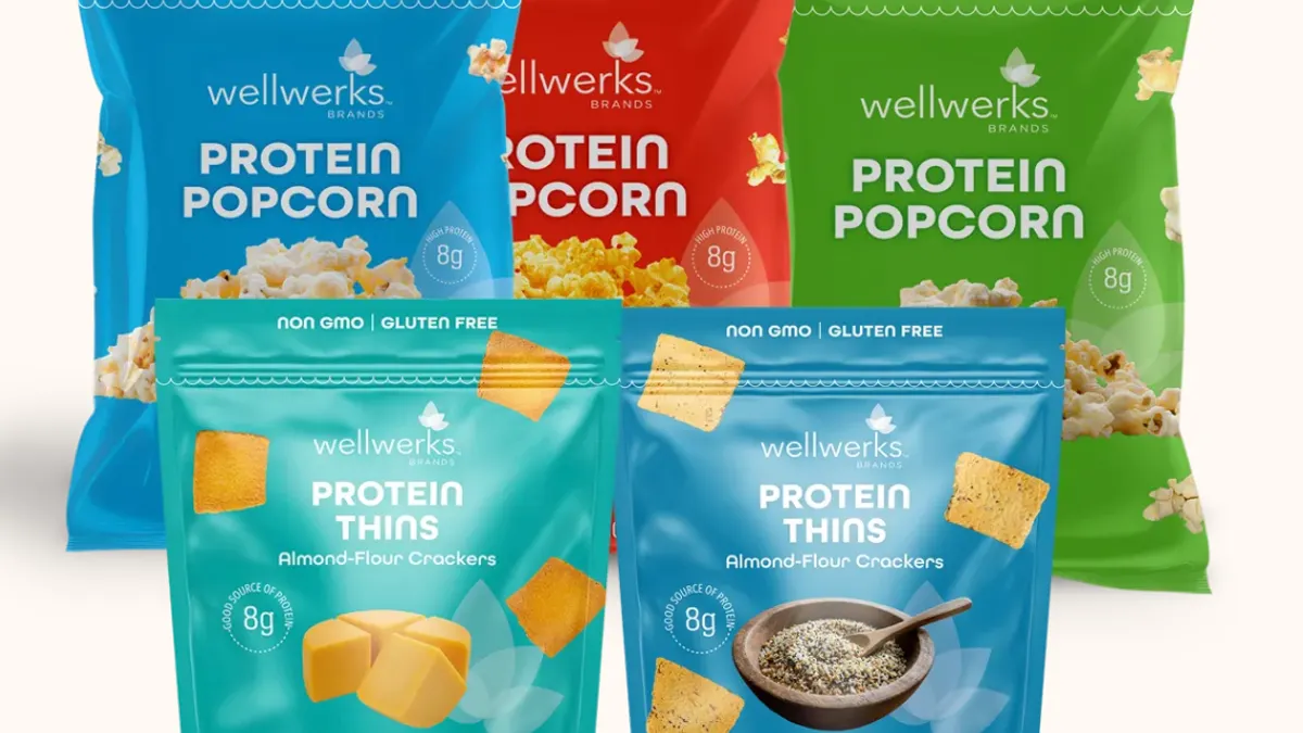 Wellwerk’s assortment includes snacks like protein-enhanced popcorn, cheese snacks touting protein and probiotic benefits, and fruit-and-nut snack bags. Nüwerk’s lineup includes powder supplements and gummies that support immunity and sleep and offer other benefits.