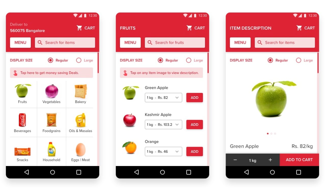 To boost the visibility of relevant buttons, Goyal added icons to the “Cart” and “Search” buttons and spelled out “MENU” instead of using the hamburger menu icon. The display interface included both regular and large display size options. Additionally, Goyal included a scroll bar on the right side for users who might not be as familiar or comfortable with the scrolling gesture on touchscreen devices.
