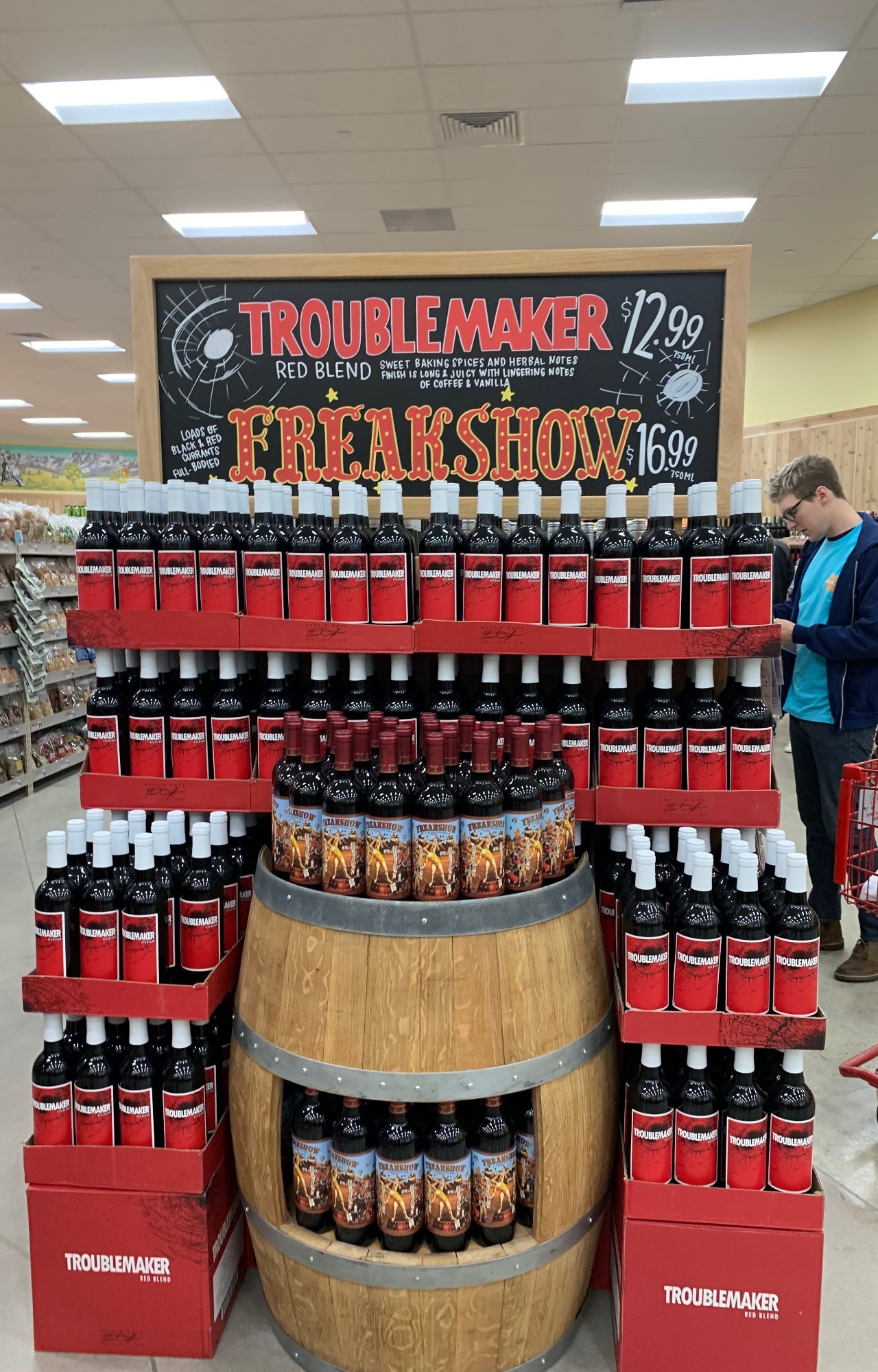 Trader Joe’s, which is known for its affordable wines including "two buck chuck," displayed an end cap with two red wine selections geared toward Halloween.