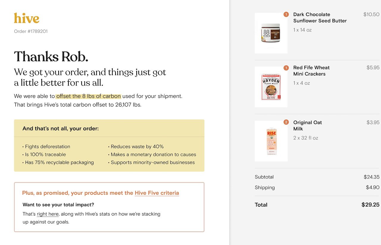 After checking out, customers get a rundown of the social and sustainability impacts of their purchases along with the pounds of carbon the company plans to offset for each shipment. In their profile page, shoppers can track the total carbon footprint of their purchases, which Hive offsets, along with other stats like total percentage of packaging that’s recyclable and number of products purchased that are certified for sustainable agriculture.