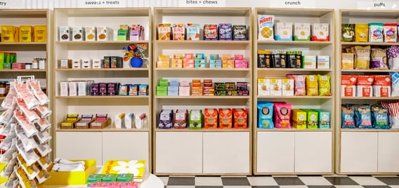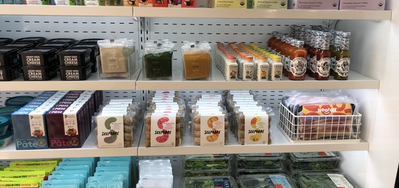A visit by Food Dive to the Chicago site in May revealed this carefully curated shopper experience. The 1,000-square-foot site, located in the hip Wicker Park neighborhood, presented its wares on simple shelving and fixtures, with a black-and-white checkered floor and primary colored walls.